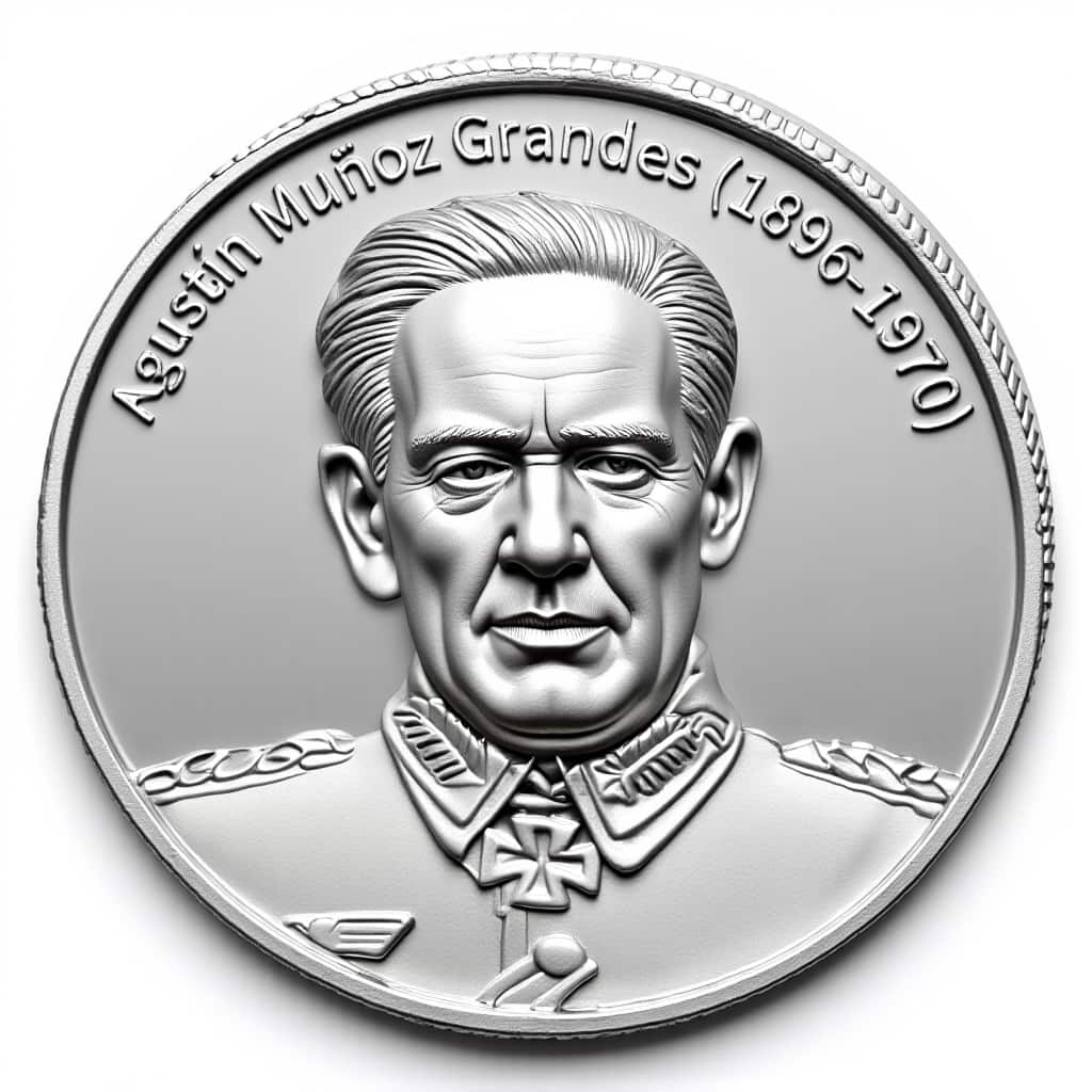 Condecoraciones y simbolismo. Muñoz Grandes acumuló numerosas condecoraciones militares; en medallas y monedas conmemorativas suele representársele en uniforme, con insignias y cruces que aluden a sus méritos de guerra y su rango. Las piezas numismáticas dedicadas a figuras militares de la época suelen buscar realismo en el retrato, inscripciones con nombre y fechas y símbolos militares (cruces, laureles, emblemas del ejército) para subrayar su trayectoria. (Contexto numismático general).
