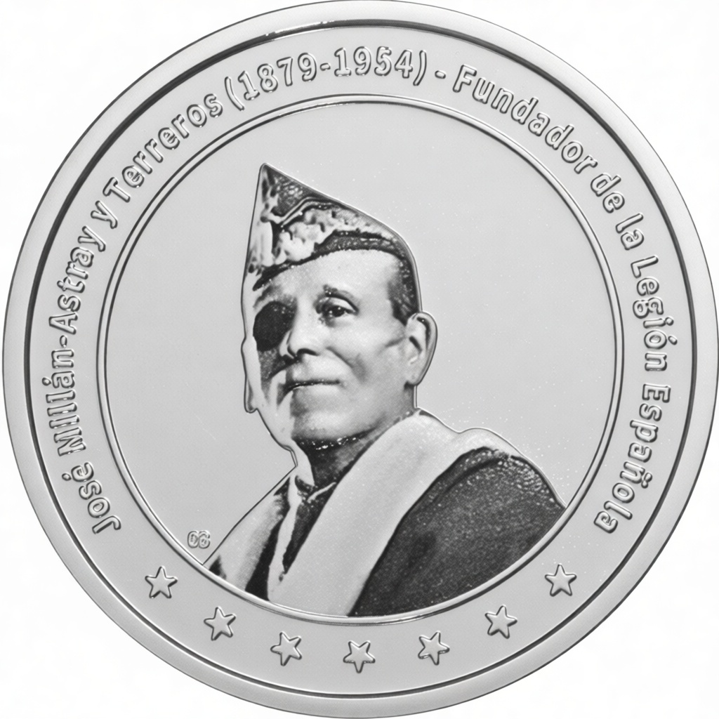 La [MDL] Moneda José Millán-Astray y la Legión Española (N) es una pieza conmemorativa creada para rendir homenaje a una de las figuras más influyentes del ejército español y a la unidad que fundó en 1920: la Legión Española. Esta moneda celebra el espíritu, la historia y los valores que han acompañado a la Legión desde su nacimiento, marcados por la disciplina, el compañerismo y el sacrificio.